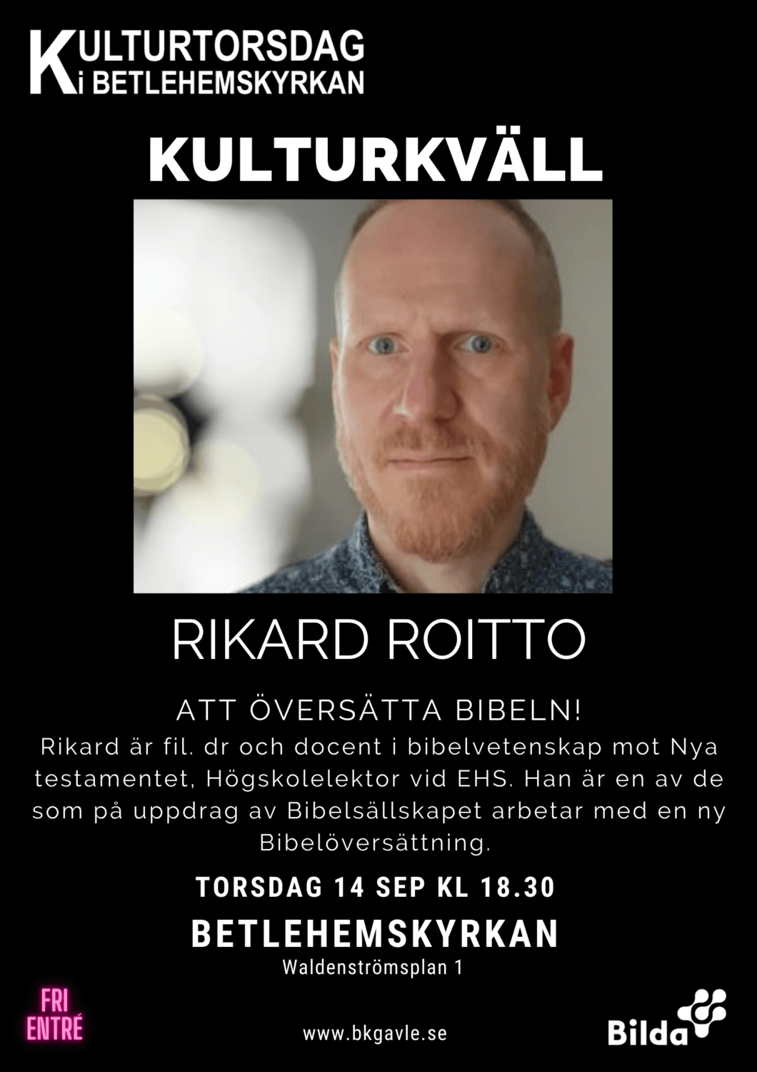Rikard är fil. dr och docent i bibelvetenskap mot Nya testamentet, Högskolelektor vid EHS. Han är en av de som på uppdrag av Bibelsällskapet arbetar med en ny Bibelöversättning.